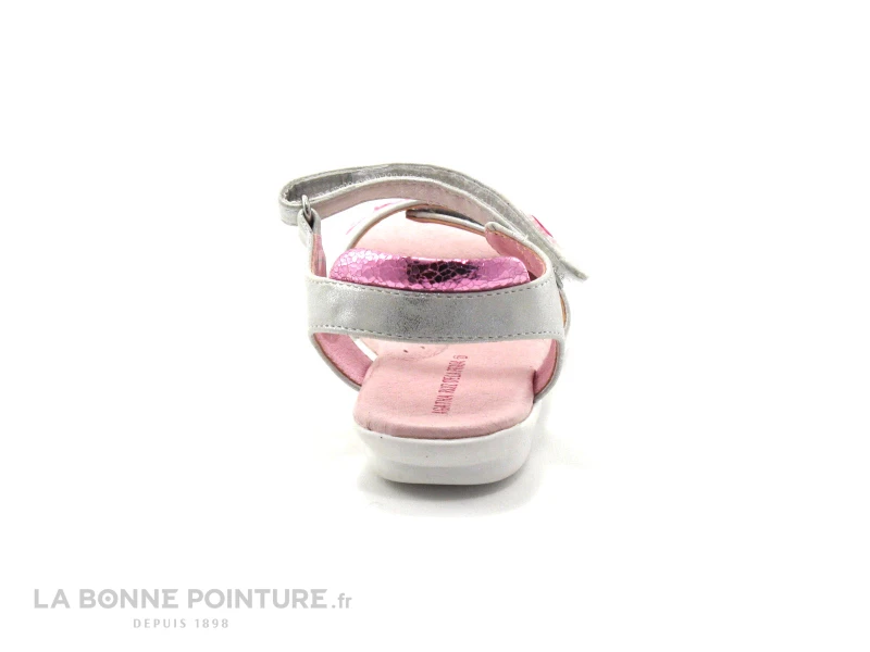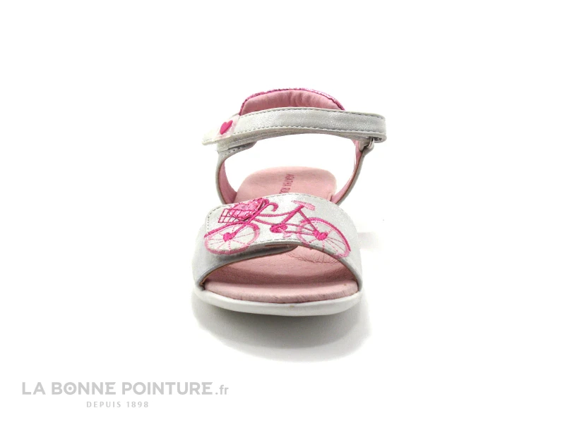 Cette sandale d’Ă©tĂ© est gris mĂ©tallisĂ©, avec un empiĂšcement rose mĂ©tal Ă l’arriĂšre, un un vĂ©lo (rose aussi !) brodĂ© sur le devant.