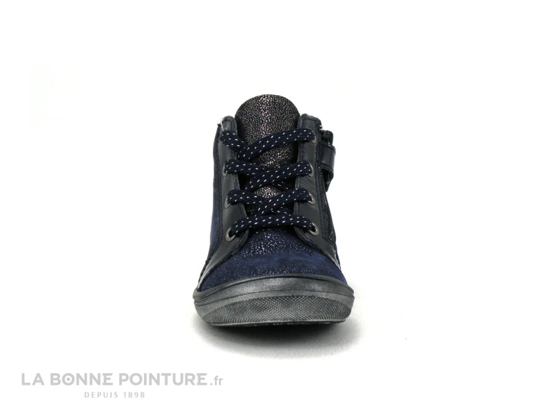 Cette basket fille bleu marine combine cuir velours pailleté et cuir verni, parce que c’est bien plus joli quand ça brille !