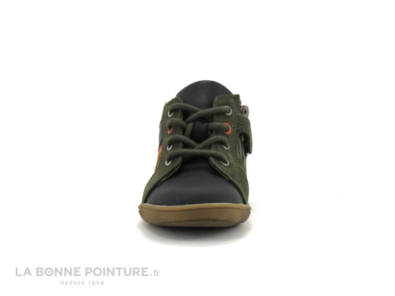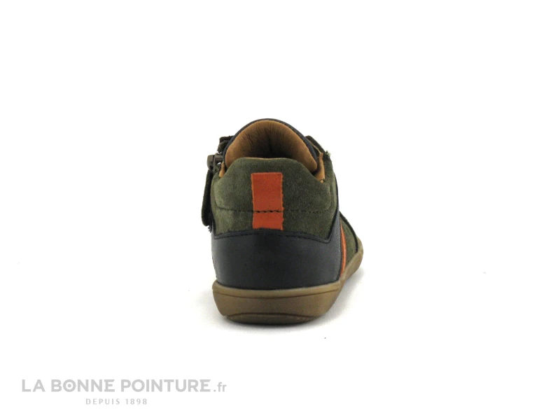 Ce bottillon garçon Bellamy mélange un cuir noir mat et un cuir velours kaki, avec un peu d’orange.