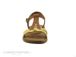 Cette sandale fille Bellamy Tilou combine un cuir marron camel et un cuir jaune aspect lézard aux reflets brillants.