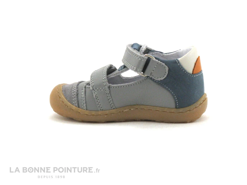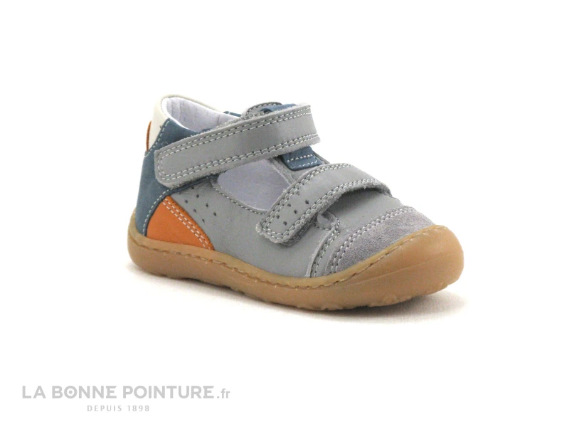 Cette chaussure montante bébé combine un cuir gris, bleu et orange, avec de petites ouvertures sur les côtés pour laisser l’air ciculer autour des petons !