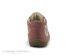 Cette chaussure montante fillette est en cuir vieux rose aspect peau de pêche, avec un chaton brillant sur le côté externe.
