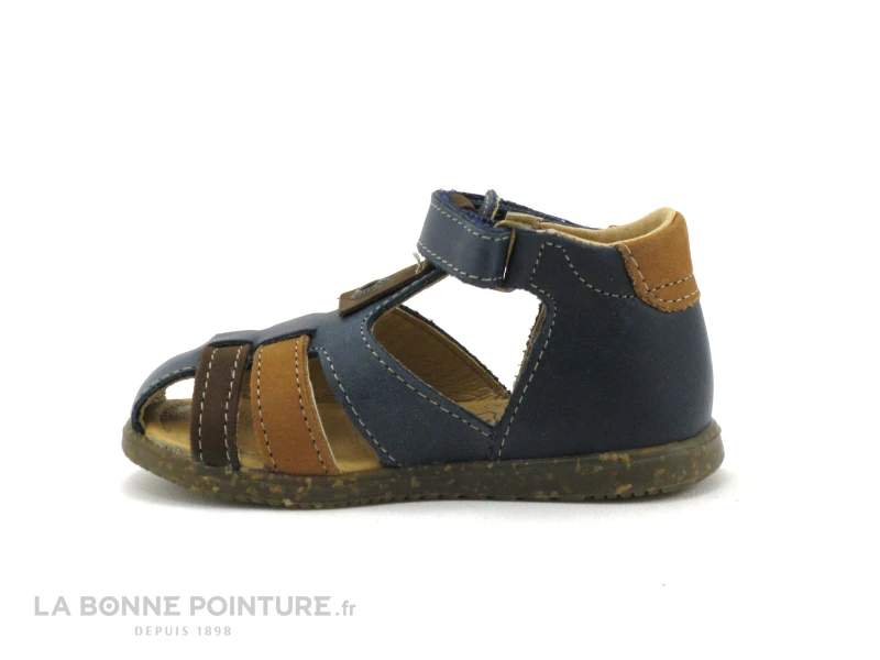 Ce nu-pieds bébé bout fermé Bopy Radius mélange harmonieusement cuir bleu marine et cuir marron, couleur chocolat et caramel…