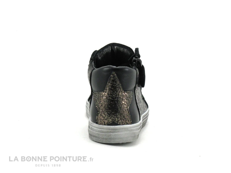 Cette basket montante fille Bopy mélange un cuir lisse noir avec un cuir imprimé or sur les côtés.