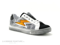 Cette basket de ville fille Bopy mélange un cuir velours noir, un cuir blanc et un cuir imprimé argenté, avec un peu d’orange métallisé sur le côté.