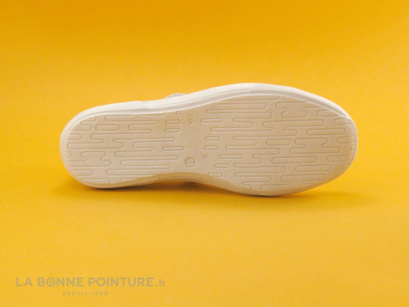 La semelle de marche blanche a des nuances grisées et argentées, elle est souple et toute légère.