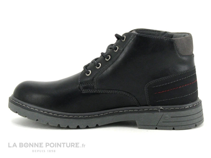 Ces bottillons à lacet Homme sont en simili cuir noir avec un peu de gris à l’arrière et sur la languette.