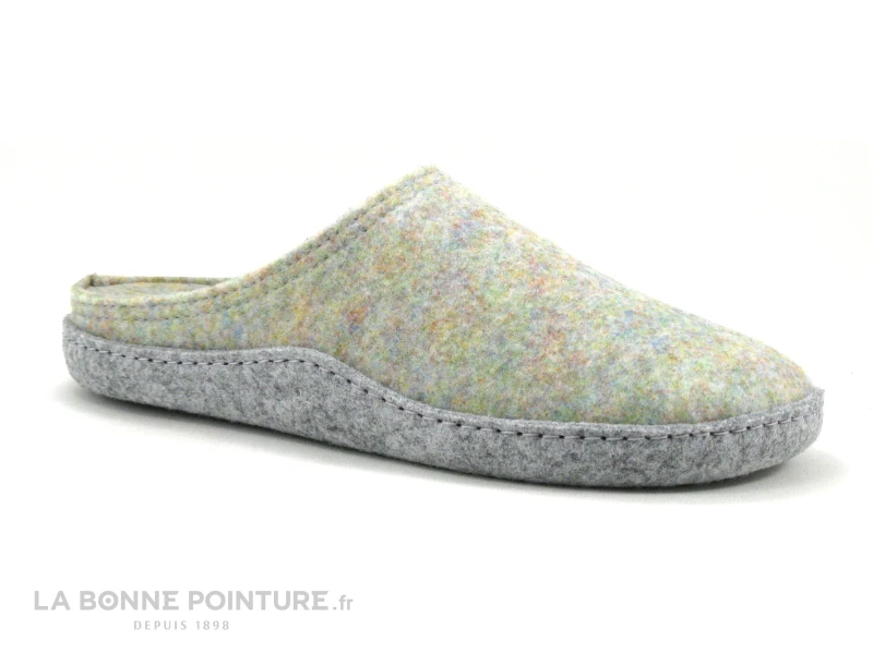 Cette pantoufle mule Femme est en feutre recyclé multicolore, avec la base grise.