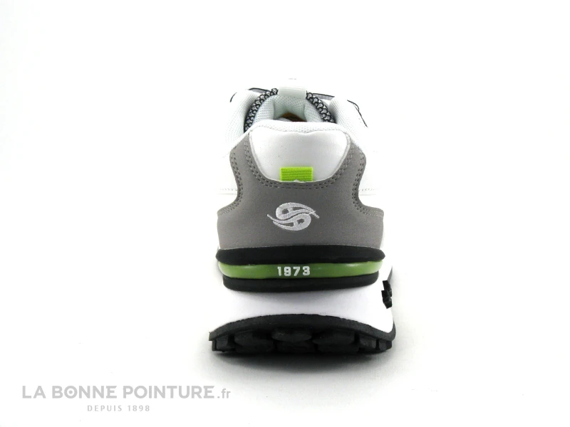 Ces sneakers mode Homme Dockers by Gerli mélangent du blanc, du gris et du beige taupe, avec un peu de noir et de vert lime à l’arrière.