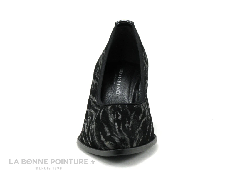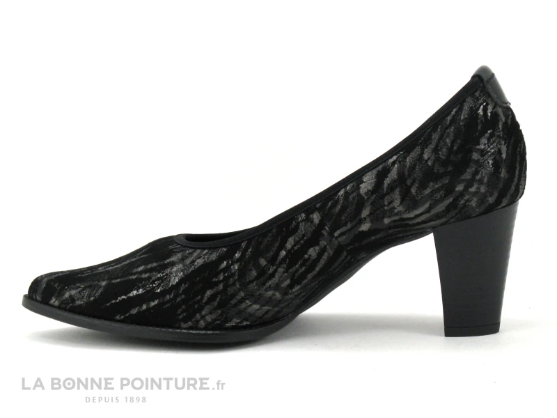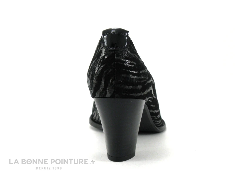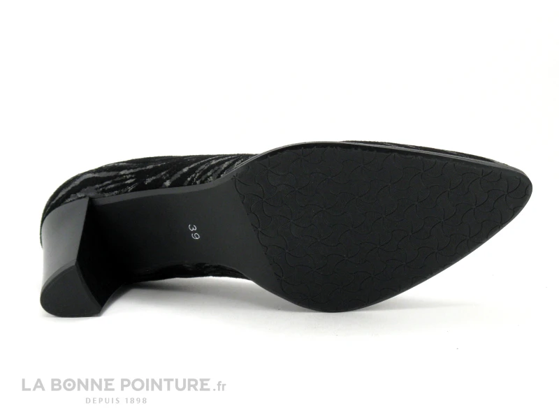 Ces escarpins adaptés aux pieds larges sont en cuir velouté noir zébrés argent, avec le bout pointu.
