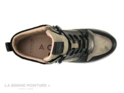 Cette basket montante Femme à semelle compensée est en cuir, combinant des parties noires et taupe velouté, noir grainé, et bronze métal.