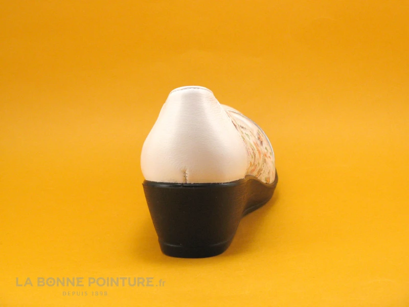 Cette chaussure confort Femme à talon compensé est en cuir imprimé de fleurs multicolores sur fond gris.