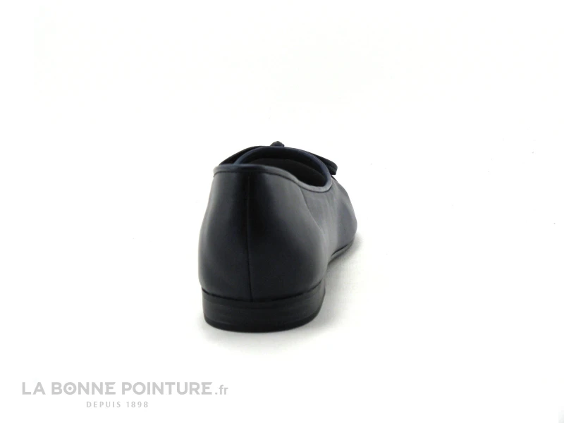 Cette ballerine à bout rond est en cuir lisse bleu marine, avec la pointe en simili cuir bleu verni et un petit noeud sur le dessus.