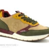 Cette basket confortable Femme Jana est en velours et tissu mesh gris clair, avec un ruban bicolore gris et bordeaux à l’arrière.