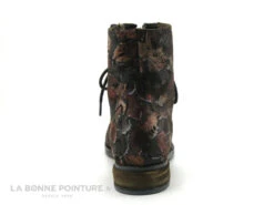Cette belle bottine à lacet Femme Josef Seibel Sanja est en cuir velours imprimé feuillage, aux tons de marron, de beige, d’orange rouille et de bordeaux.
