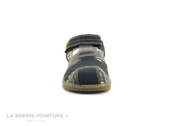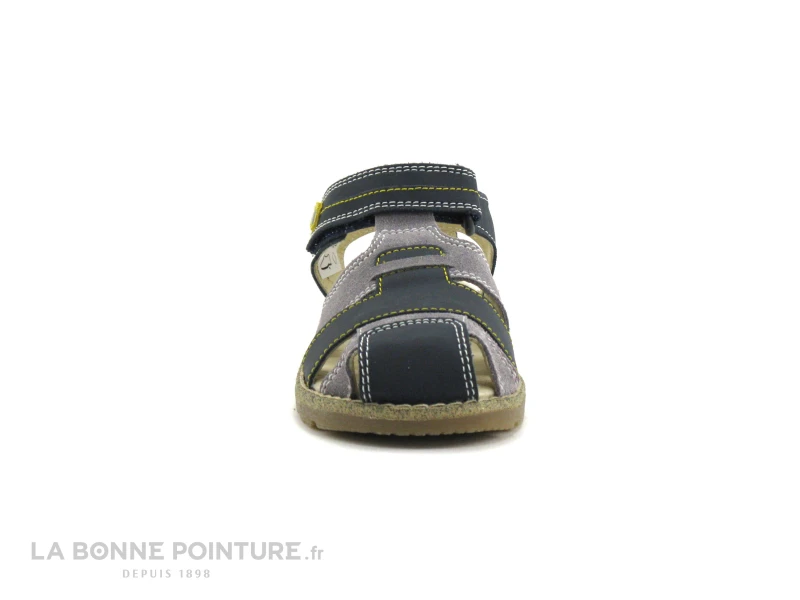Cette sandale enfant bout fermé est en cuir bleu marine et gris, avec des coutures jaunes qui rappellent le petit empiècement en cuir jaune sur l’arrière.