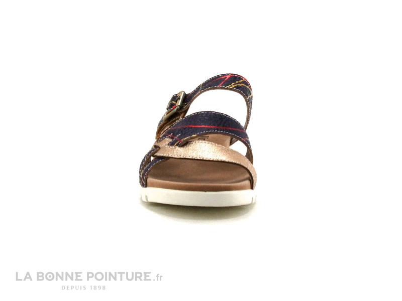 Cette chaussure ouverte Laura Vita Docbbyo 059 combine un cuir violet traversé par des lignes rouges et dorées avec un cuir métallisé rose gold.