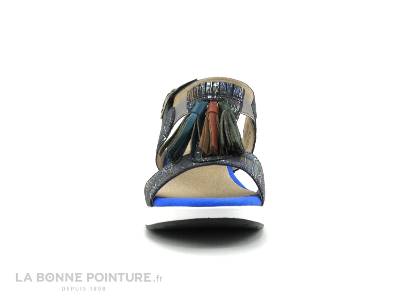 Détail mode : les 3 petits pompons à franges, bleu, rouge/bordeaux et vert, qui habillent avec charme le devant des chaussures Laura Vita.