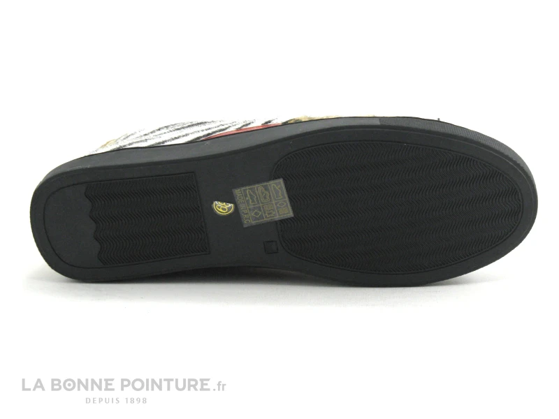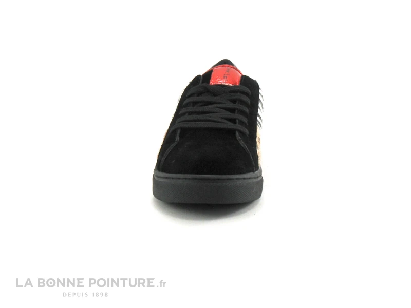 Cette tennis mode Femme mixe des empiècements noir velours, zèbre noir et blanc et léopard beige, avec une touche de rouge métal et de doré : effet garanti !