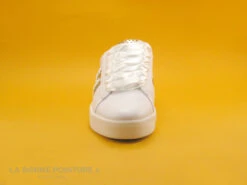 Cette tennis Femme est blanc mat, avec des touches de rose nude brillant et 7 étoiles sur le côté externe de la chaussure.