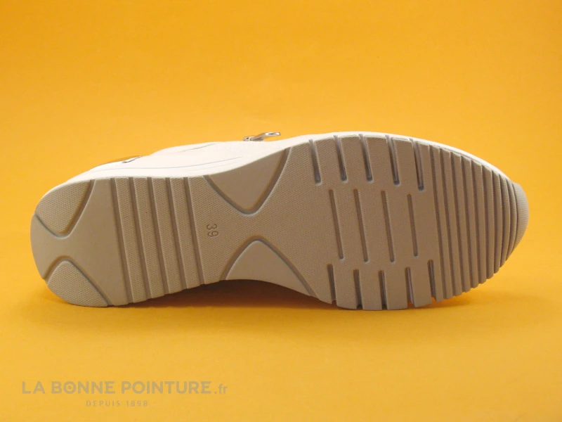 La semelle de marche avec talon compensé est souple, mesurant environ 6.5 cm de hauteur. Détail mode : la bande argentée à l’arrière des baskets MTozzi 23743…