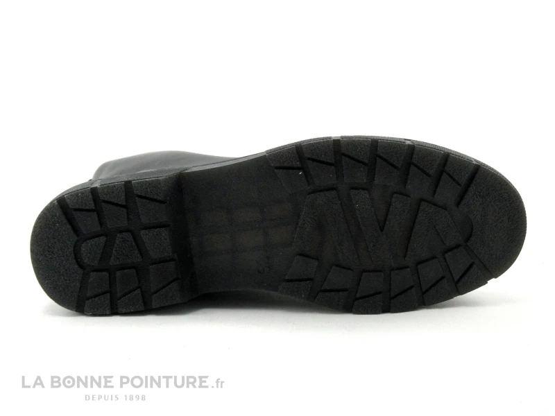 La semelle de marche noire du bottillon noir Femme est assez Ă©paisse, avec un talon d’env. 3.5 cm.