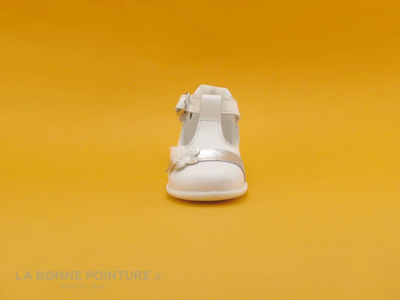Cette sandale premiers pas est en cuir lisse blanc, avec un liseré et une petite fleur argentés sur le devant. La fleur est ornée de tulle pour une finition réussie…