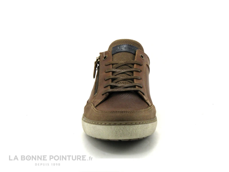 Cette basket de ville Homme associe cuir lisse et cuir velouté marron, avec un peu de bleu marine autour de la cheville.