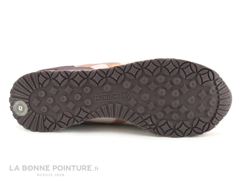Ces sneakers Femme Munich Sunset 21 sont en textile et matières synthétiques résistantes vieux rose et beige, avec l’arrière bordeaux/prune.