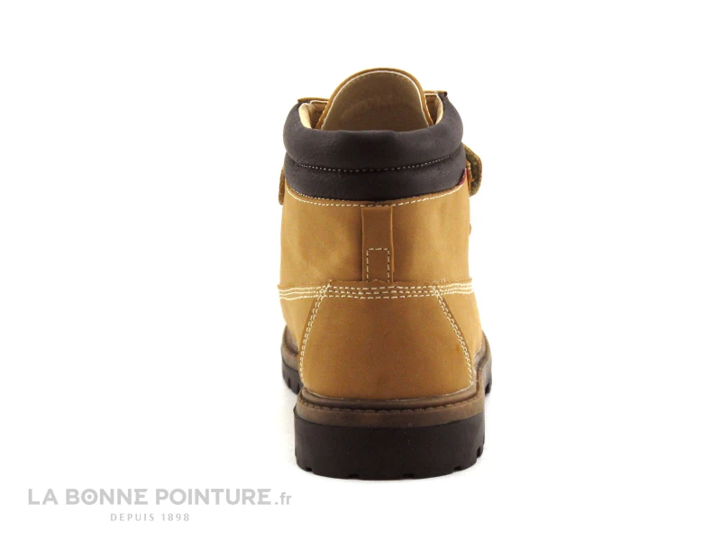 Cette chaussure montante enfant est en simili cuir camel / jaune gold, avec l’encolure noire et matelassée.