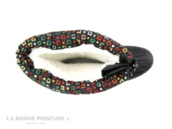 Le haut des boots neige est en textile nylon imprimé de petits carrés multicolores sur fond noir.