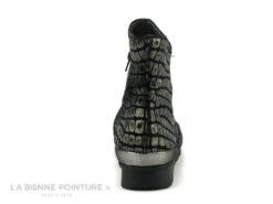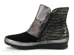 Cette bottine Femme est tout en cuir aux tons de noir, de bronze métal et d’argent, avec des parties veloutées, pailletées et aspect croco en parfaite harmonie.