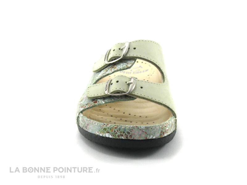 Cette mule confort Femme Pedi Girl Well mélange un cuir velouté vert amande (kaki trÚs clair) et un cuir imprimé floral, avec une petite touche argentée.