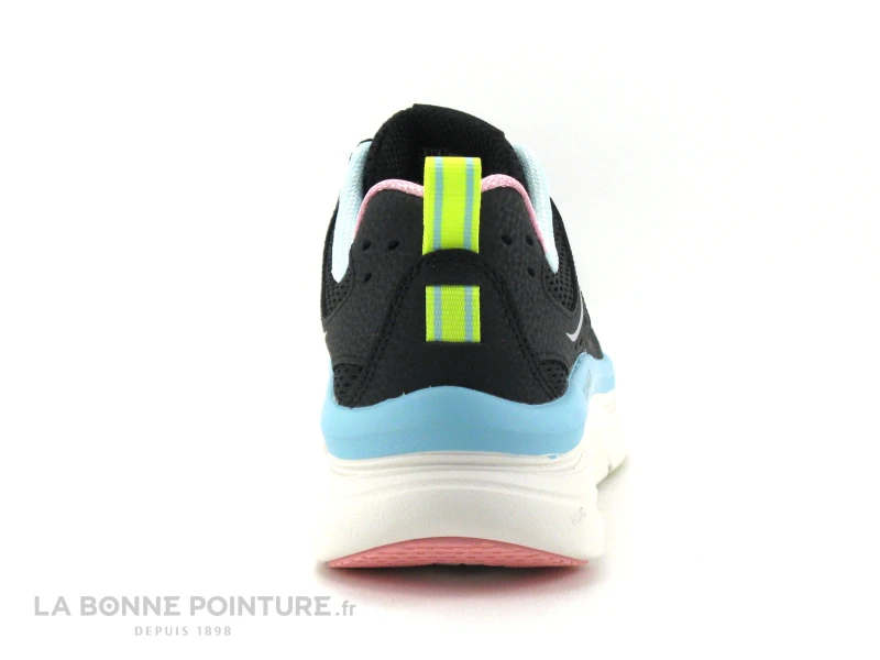 Cette chaussure sport Femme Skechers DLUX Walker Infinite Motion est en cuir et textile maille noir, avec des petites touches de bleu turquoise, de rose.