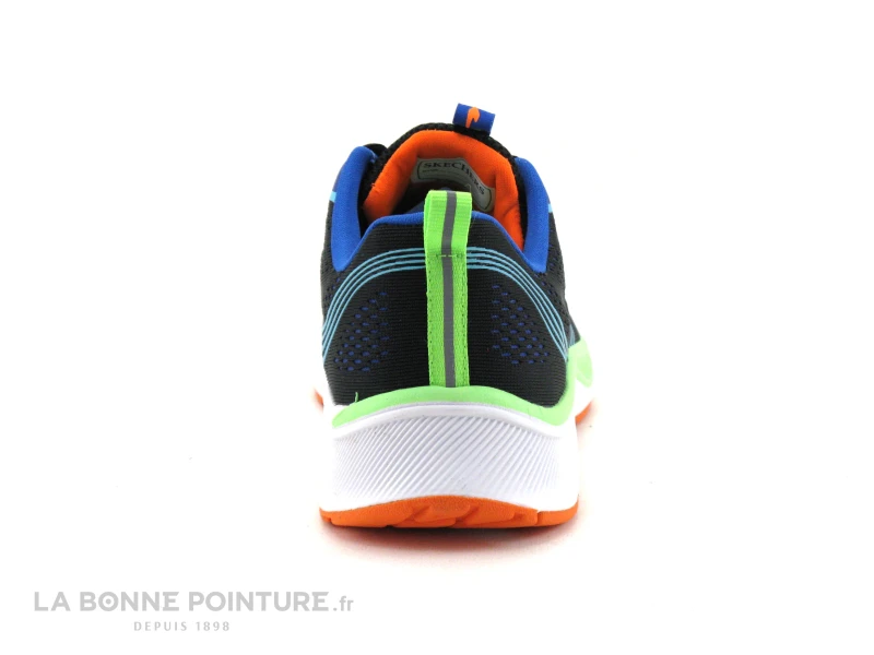 Cette basket Skechers 403951 lavable en machine est en maille et matiĂšres synthĂ©tiques, aux tons de noir, de bleu, de vert et d’orange.