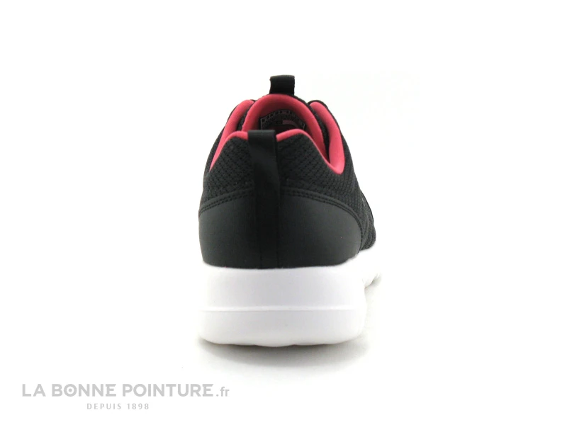 Cette chaussure de sport légère Skechers est principalement en maille noire, avec la doublure rose fuchsia.
