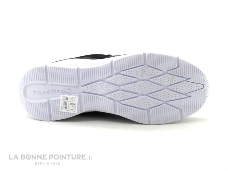 Souple et très légère, la semelle de marche de la chaussure Skechers est blanche avec un coussinet translucide au talon.