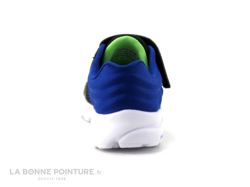 Cette basket enfant lavable en machine Skechers est en textile et matières synthétiques résistantes noir et bleu royal, avec une pointe de vert.