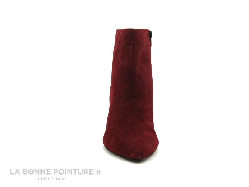 Cette bottine pointue est en cuir velours bordeaux (merlot), un coloris mode et facile Ă porter.