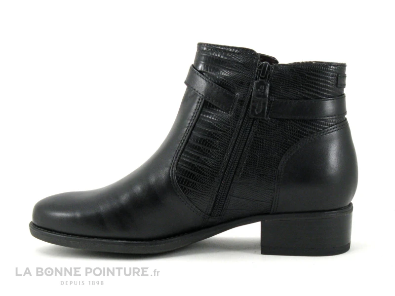 Cette bottine Femme Tamaris est principalement en cuir noir, avec les cÎtés structurés aspect reptile.