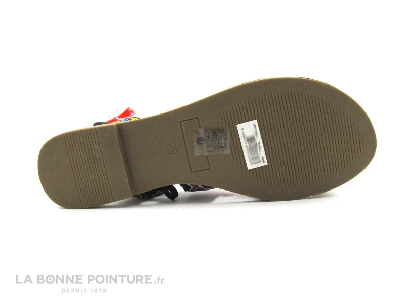Cette tong Ă lacet est composĂ©e de brides et d’un passe-orteil noirs et tissĂ©s, avec des pompons multicolores.