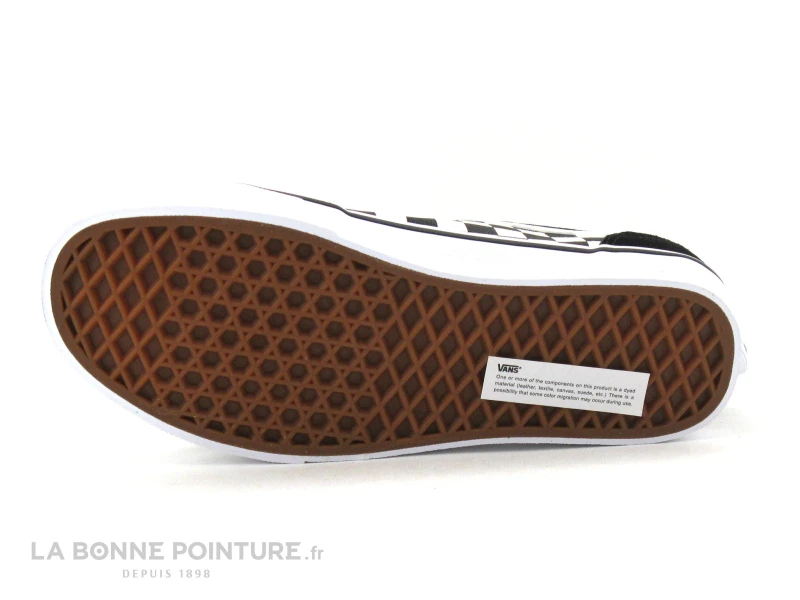 La semelle de marche de la chaussure Van’s bicolore est souple, blanche avec un liseré noir sur le pourtour.