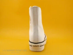 Cette tennis montante Victoria est toute blanche, avec 2 lignes noires sur la semelle de marche.