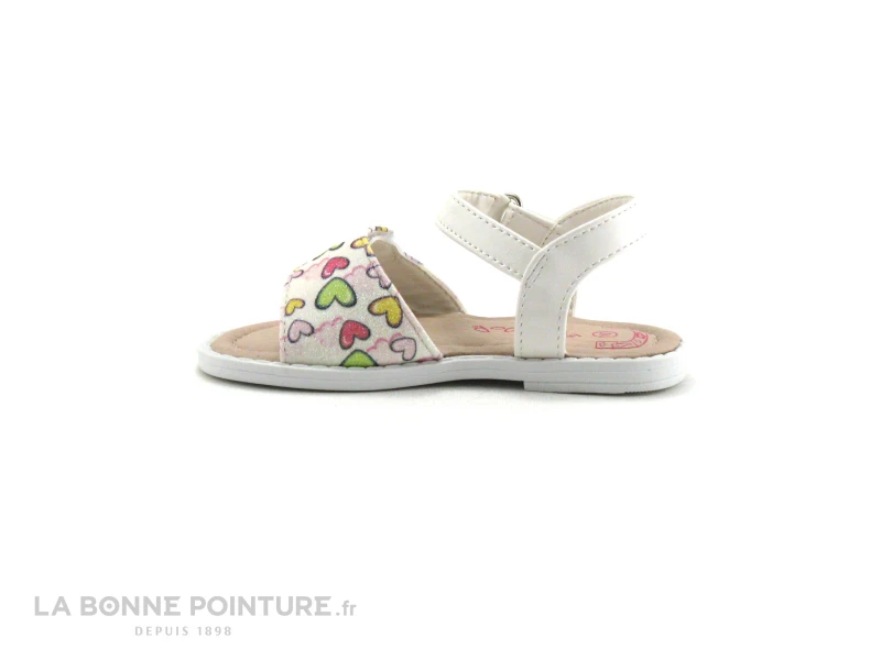 Ce nu-pieds enfant est blanc, avec la bride avant pailletée imprimée petits coeurs multicolores.