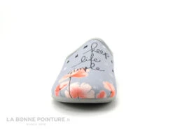 Cette mule d’intérieur Zels est en textile gris avec des fleurs et des oiseaux, ainsi que l’inscription « keep life simple ».